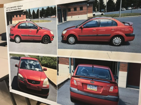 A board is displayed at a press conference, showing the red Kia Rio police believed was involved in Linda’s abduction (source: Penn Live)